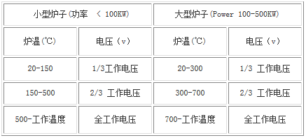 新筑成的或長(zhǎng)期不使用的爐子在使用前需要干燥,干燥溫度為100-200℃。大型爐子干燥時(shí)間長(zhǎng),最好使用其它發(fā)熱元件烘爐,以免硅鉬棒低溫氧化,爐子烘干后,即可按以下步驟起動(dòng)升溫。