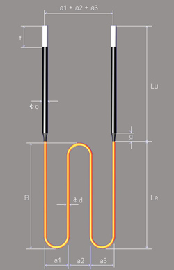 c=冷端直徑;d=熱端直徑;Le=熱端長(zhǎng)度;Lu=冷端長(zhǎng)度;a1+a2+a3=間距